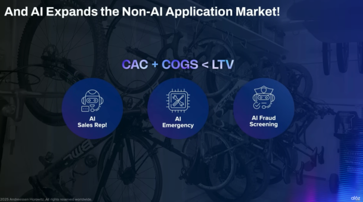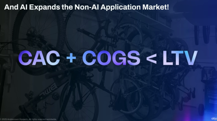 另一个有趣的观点是,因为AI,很多过去不可行的非AI公司现在也可行了。Alex因为受伤不能骑自行车,他的车库里有很多闲置的自行车。他问:为什么没有自行车的Airbnb?没人做这个的原因很简单:这是个很糟糕的主意。为什么糟糕?因为一个核心原则,不管有没有AI,即使在公元前2000年也适用:如果你的客户获取成本(CAC)加上销售成本(COGS)大于客户生命周期价值(LTV),就不要做。这不是生意。