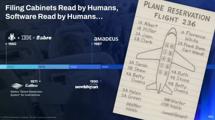 Alex在演讲中花了很长时间讲软件行业的历史,我认为这部分特别重要,因为理解过去才能真正看清未来。他举的第一个例子是SabreSystems,这是美国航空和IBM在1959年共同开发的航空订票系统。在那之前,航空公司是怎么管理订票的?想象一下,有无数个文件柜,里面塞满了表格。BettyOwens打电话来说她想要4A座位,工作人员在纸上写下来。然后她又改主意说要取消,工作人员擦掉。她再改口说要2C座位,工作人员又擦掉重写。这个过程效率极低,而且信息无法在不同办公室之间共享,因为所有数据都锁在一个物理的文件柜里。Sabre把这一切搬到了IBM大型机上,通过分布在全球各地的终端,旅行社可以访问同一个系统。这彻底改变了旅游行业的运作方式。