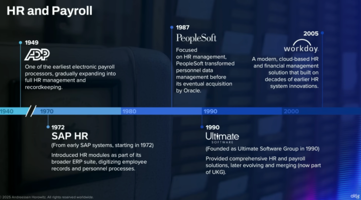 医疗健康记录领域有一个特别有趣的故事。第一个电子健康记录公司叫MUMPS,Alex说这可能是软件历史上最糟糕的名字,听起来像是输给了疟疾或麻疹什么的。这是麻省总医院开发的,他们想要替换掉那些海量的纸质文件,于是创造了这个编程语言和数据库系统。现在最大的电子健康记录公司Epic成立于1979年,还有Cerner,它们做的就是把医院系统和医生办公室里的海量文件数字化。人力资源和薪资管理也是类似的。ADP(自动数据处理公司)成立于1949年,甚至比Sabre还早。如何追踪考勤?如何计算税务扣缴?这些公司的发展轨迹都是从大型机开始,然后像Workday这样的公司(实际上是PeopleSoft的同一个团队)把它搬到了云端。但流程还是一样的,1940年查看考勤卡的人和2015年查看Workday记录的人,做的是同一件事,只是介质不同而已。