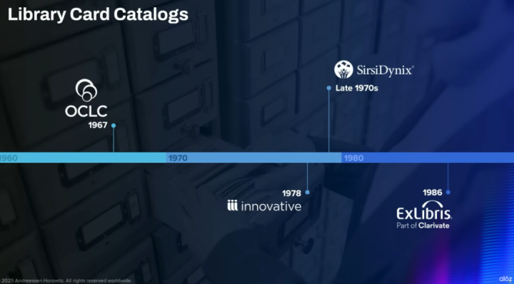 制造业和库存管理也是如此。作为产品制造商,你需要知道自己有多少库存,销售情况如何。IBM再次走在前沿,但其他公司也跟进了,比如1972年成立的SAP,还有Baan、JDEdwards、Epicor、Sage等等。这些都是把老式纸质记录数字化的公司。我特别喜欢Alex举的一个例子:图书馆卡片目录。图书馆存在了很长时间,从亚历山大图书馆时代就有了。杜威十进制分类法出现后,我记得小时候去图书馆,都是在卡片目录柜里按字母顺序查找书籍。后来有公司专门做这个生意,比如OCLC,他们把这些卡片目录数字化,让你可以在图书馆的电脑终端上查询,而不是翻卡片。