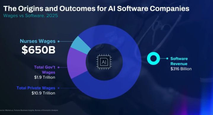 Alex给出了一个让人震撼的数据对比。他说仅看护士这一个职业,美国的注册护士每年收入总计约6500亿美元,大约有450万注册护士。这个单一职业的市场规模就比整个全球软件市场还大。当然这不意味着护理软件市场会有6500亿美元,但这说明软件真正竞争的池子有多大。