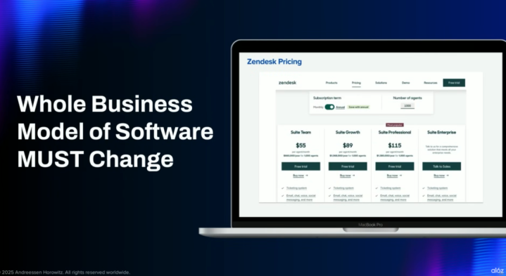 Alex用了一个非常形象的比喻来描述当前的SaaS定价模式,他称之为”星巴克模式”——Tall、Grande、Venti(小杯、中杯、大杯)。如果你去任何一家SaaS公司的网站,他们的定价页面可能都长这样。他举了Zendesk的例子,这是一家现在被私有化的公司,年收入20亿美元,销售的是座席数。他们最受欢迎的套餐是SuiteProfessional,每月115美元。但问题来了:如果AI能够非常好地回答客户支持问题,那么当每个客服人员的生产力提高9000倍时,你还需要多少座席?