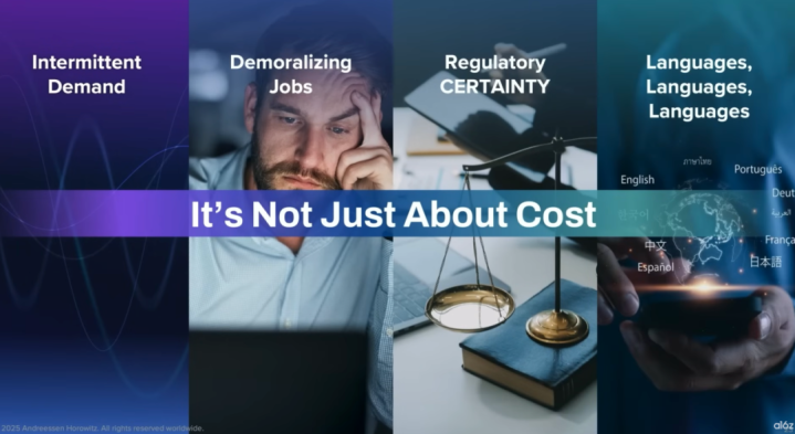 我特别认同Alex关于AI独特优势的分析。很多人把AI看作是更便宜的劳动力,但这是肤浅的理解。AI的真正价值在于它能解决人类劳动力结构性无法解决的问题:间歇性需求、令人沮丧的工作、监管确定性、多语言能力。这些不是效率问题,而是能力问题。AI不是在和人类竞争,而是在补充人类的不足。