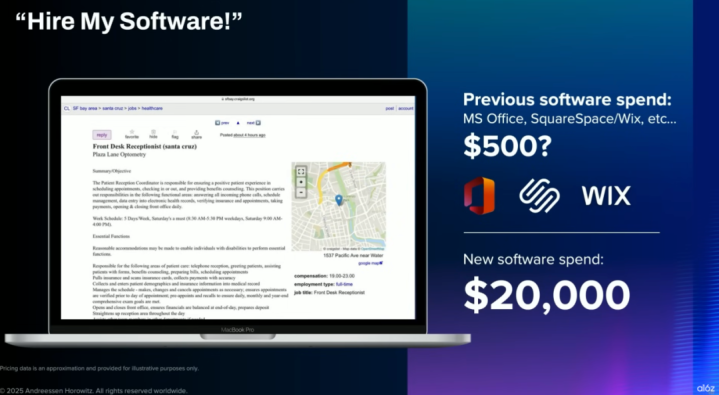 但在这个新世界里,Alex说他们看到很多公司在做这件事:浏览Craigslist,寻找招聘信息,然后说:”嘿,PlazaLaneOptometry,我想申请这个职位。”眼科医生会问:”好啊,说说你的资质,你以前在哪工作?”AI回答:”听起来可能有点奇怪,但我是一家软件公司,我不能开门关门,但我可以做其他八件事。要不要看个演示?”一开始眼科医生可能会说不,但后来会说:”好吧,我试试看。”而且价格是每年2万美元,远低于你招不到人的4.5万美元。