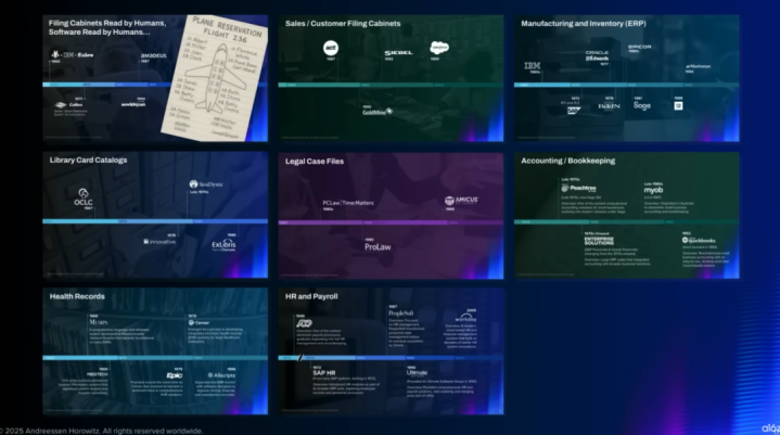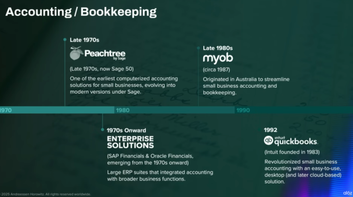 法律行业也一样。Alex说他在1980年代去律所的时候,发现大部分空间都被文件柜占据了。像PCLaw、LexisNexis和Reuters这样的公司,很大一部分收入来自为律所提供数字化服务,把那些本来要占据昂贵办公空间的文件数字化。会计行业也是如此。我记得小时候去会计师办公室,到处都是文件柜,根本没有空间让一个5岁小孩跑来跑去。然后Intuit推出了QuickBooks,把财务报表数字化了。还有Peachtree、MYOB等公司,都在做同样的事情。