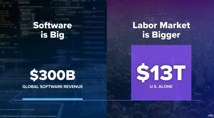 你有没有想过,软件行业真正追逐的目标是什么?不是更多的用户,不是更高的市场份额,而是整个劳动力市场。这听起来像是天方夜谭,但当你看到数字时就会明白:全球SaaS(软件即服务)市场规模约为3000亿美元,而仅美国的劳动力市场就高达13万亿美元。这个巨大的差距正在被AI技术快速缩小。我最近看了a16z合伙人AlexRampell在他们2025年LP峰会上的演讲,他用一个非常独特的视角解释了这场正在发生的变革:软件不再只是记录信息的工具,而是开始真正执行劳动本身。这个观点让我思考了很久,因为它触及了软件行业一个根本性的转变,而大多数人还没有真正意识到这意味着什么。
