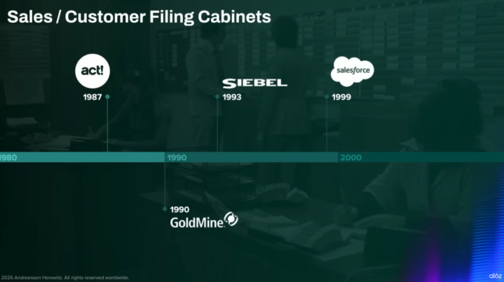 同样的故事在各个行业重复上演。销售领域,Alex提到了电影《拜金一族》里那些业务员为了获得好的客户名单而拼命竞争,那些名单就是一张张纸。1980年代出现了ACTSystems,1990年有GoldMine,1993年TomSiebel创立了SiebelSystems,这些都是CRM(客户关系管理)系统的先驱。然后Salesforce在1999年把这一切搬到了云端。但本质上,1950年代电影里那个翻查纸质文件的销售人员,和2010年打开Salesforce记录的销售人员,做的是同样的事情,只是介质从纸变成了屏幕。