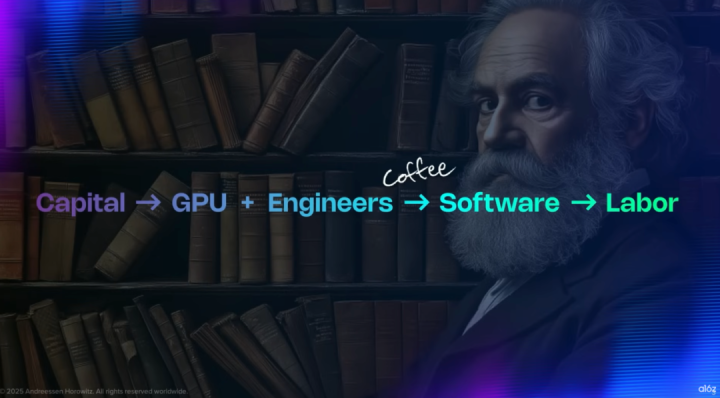 我想起了Alex在演讲开头展示的那张卡尔·马克思的照片。他说如果你读过《资本论》,核心观点是资本和劳动是两个不同的东西,资本剥削劳动。但现在发生了什么?我们给公司投资资本,公司用这些资本买GPU或租用它们,雇工程师,买咖啡,把咖啡和GPU给工程师。然后产出的软件可以完成劳动的工作。这就像是新的E=MC²。